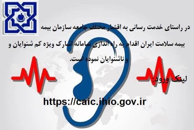 سازمان بیمه سلامت ایران، در راستای خدمت رسانی شایسته، اقدام به راه اندازی سامانه «اشارک» ویژه کم شنوایان و ناشنوایان، با آدرس اینترنتی https://caic.ihio.gov.ir نموده است.