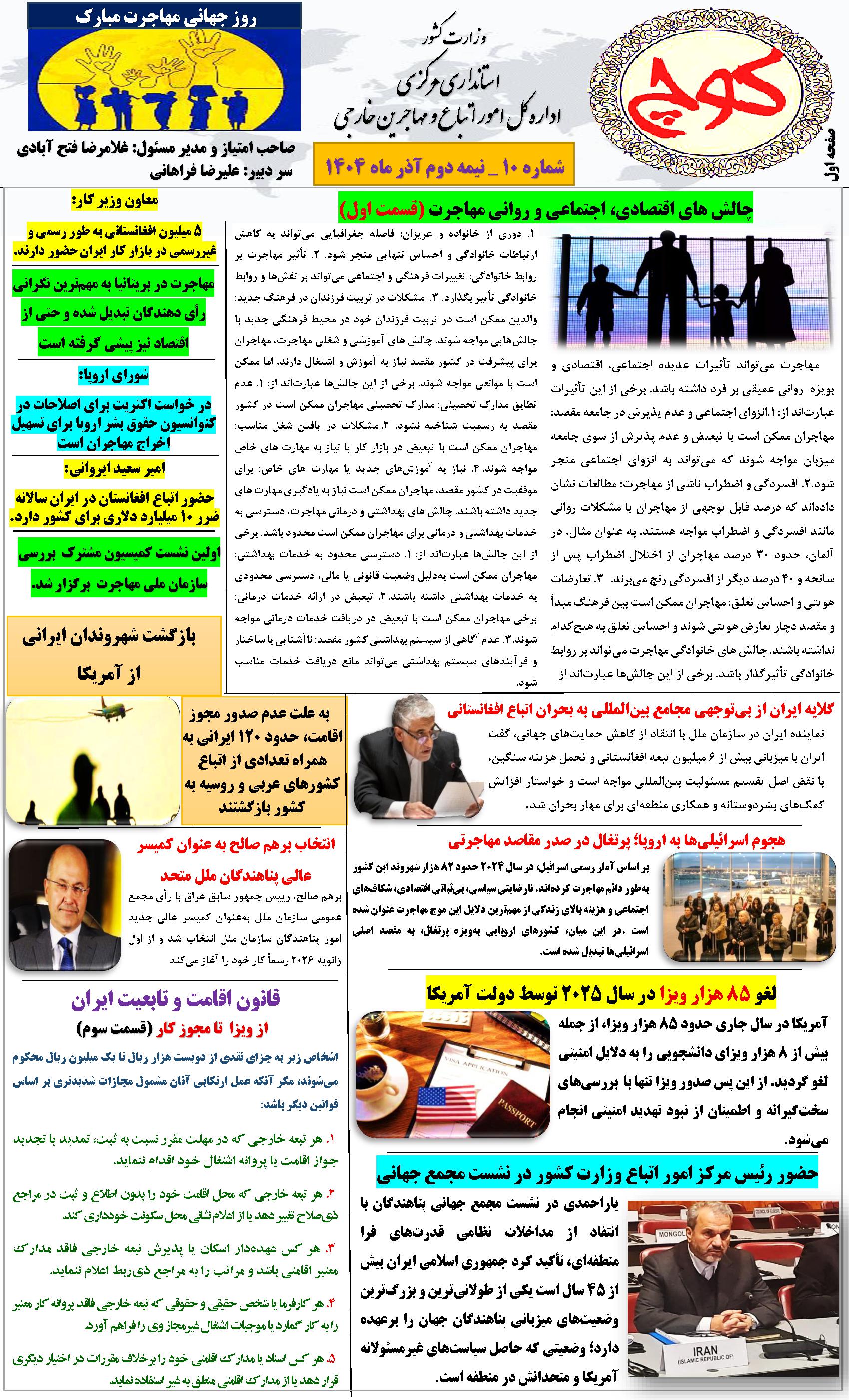 دهمین شماره نشریه کوچ ۰۳ دی ۱۴۰۴ | ۰۹:۲۱ کد : ۵۷۵۲۰ اطلاعیه ارسال به دیگران نام شما ایمیل شما ایمیل دریافتکننده ارسال انصراف تعداد بازدید:۱۲۵ دهممین شماره نشریه کوچ، توسط دفتر امور اتباع و مهاجرین خارجی استان مرکزی منتشر گردید.