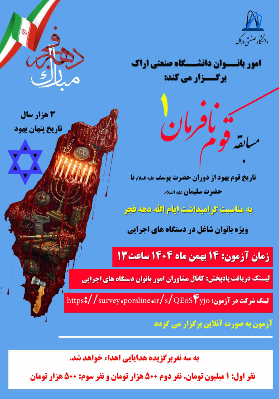مسابقه قوم نافرمان ۰۸ بهمن ۱۴۰۴ | ۱۰:۳۹ کد : ۵۷۷۴۳ اطلاعیه ارسال به دیگران نام شما ایمیل شما ایمیل دریافتکننده ارسال انصراف تعداد بازدید:۲۲۶ برگزاری مسابقه قوم نافرمان، در ایام الله دهه فجر
